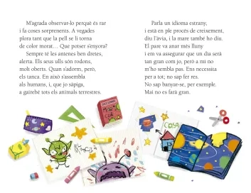 A casa d’en Lluc fa poc que ha arribat un marcià, i sembla que ha vingut per quedar-s’hi. Això és el que li han dit. El marcià no sap fer res tot sol, li han de donar el menjar, l’han de banyar i moltes altres coses. En Lluc comparteix habitació amb ell i, per si de cas, també ha après a tenir-ne cura, tot i que no està gairec onvençut que sigui una bona idea conviure amb un marcià.
