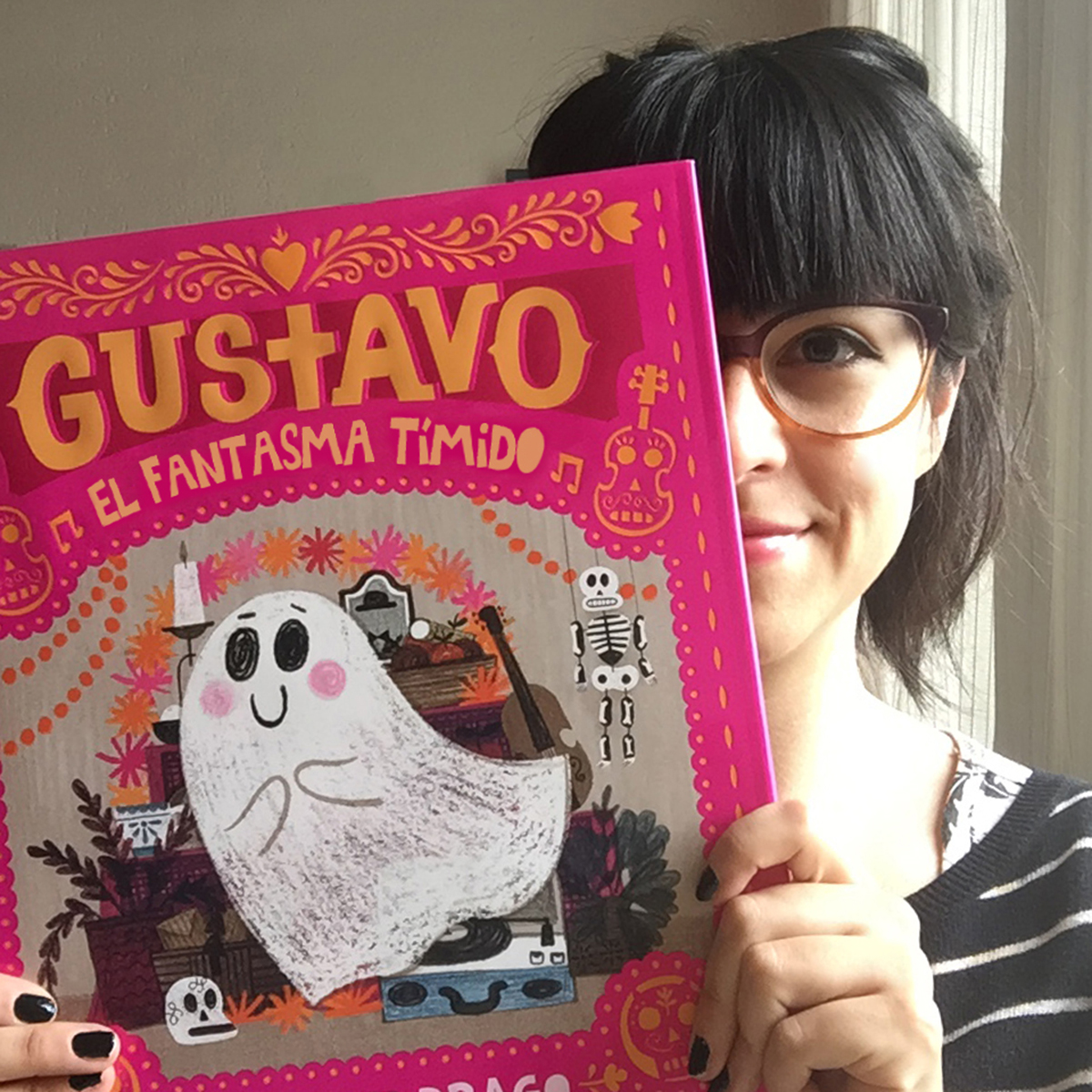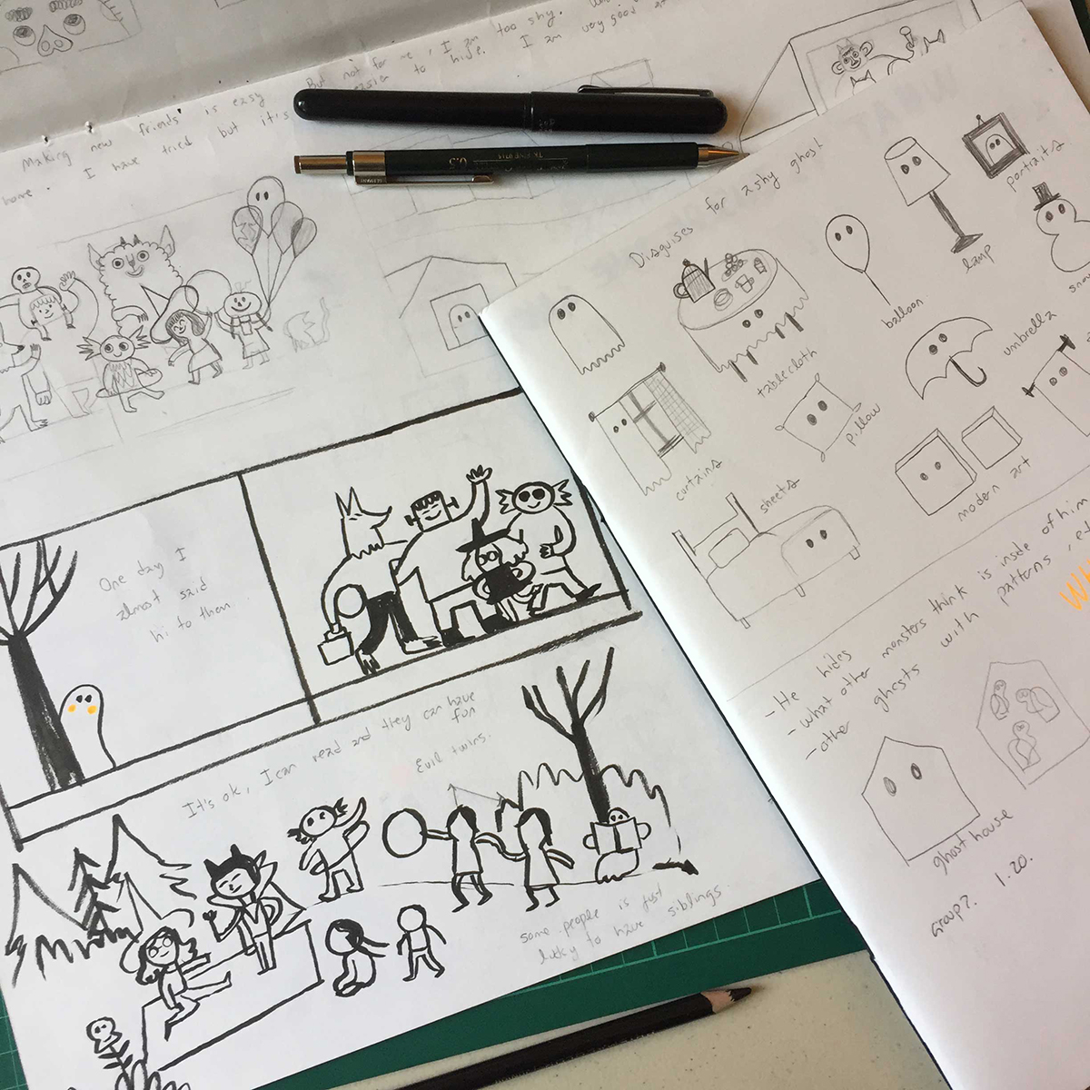 Al momento de crear este libro, primero llegó la idea. Después hice muchos dibujos para conocer a Gustavo. Al principio, yo no sabía si Gustavo iba a ser un niño disfrazado o un fantasma real, pero conforme más dibujaba, me fui dando cuenta de que, como fantasma, Gustavo podía hacer un montón de cosas divertidas como atravesar paredes, hacer volar objetos, brillar en la oscuridad y transformarse en distintas cosas, lo cual ayudó muchísimo a la trama de la historia. A la par iba escribiendo pequeñas notas y, una vez que tuve muchos dibujos, los organicé y fui agregando los textos para ver cómo funcionaban en conjunto. Mi equipo de diseño y edición me ayudó mucho a ir revisando qué funcionaba mejor para la historia. Existieron muchas versiones antes de llegar al libro definitivo.