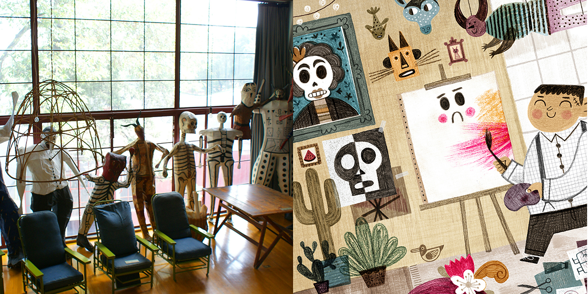 Encontrarán muchas ofrendas, calaveras, la Catrina y patios coloniales basados en edificios que conozco. La casa de Gustavo, por ejemplo, está inspirada en una casa abandonada en mi barrio, Azcapotzalco. También aparece por ahí el estudio de Diego Rivera, el importante muralista mexicano que durante algún tiempo estuvo casado con Frida Kahlo.